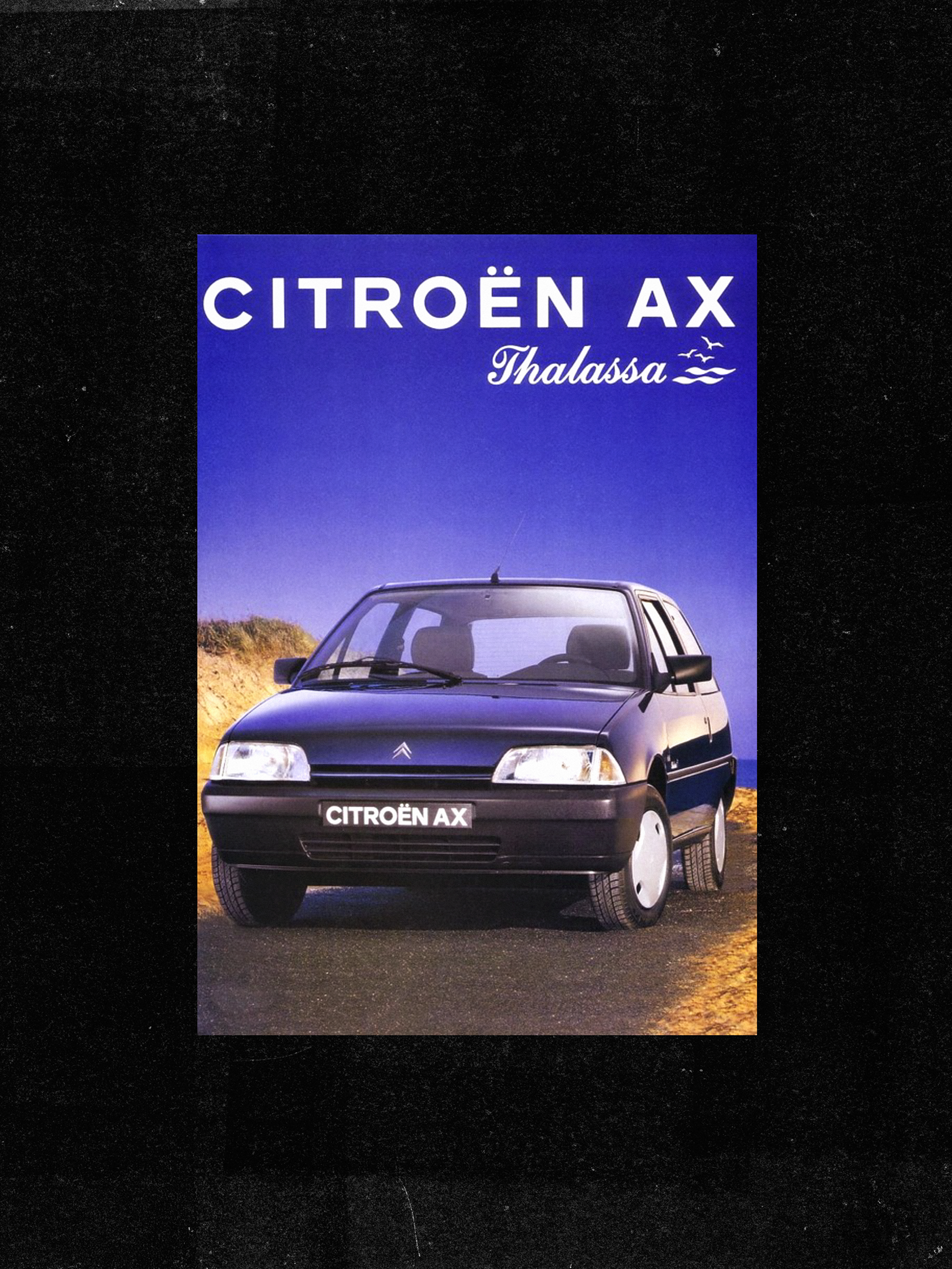 C’est précisément ce positionnement que traduit sa campagne publicitaire. L’affiche présente la CX en trois-quarts avant, traitée comme une véritable icône. La composition repose sur une économie de moyens : fond blanc, typographie noire monumentale et un seul objet central. Le slogan « Moi, je. » occupe tout l’espace supérieur, imposant un ton volontairement affirmé et presque provocateur. Cet égocentrisme assumé reflète l’individualisme d’une époque où l’automobile reste symbole de réussite. La photographie accentue le caractère statutaire du modèle : la contre-plongée souligne le capot allongé et la fluidité du profil, tandis que les reflets chromés suggèrent prestige sans ostentation.