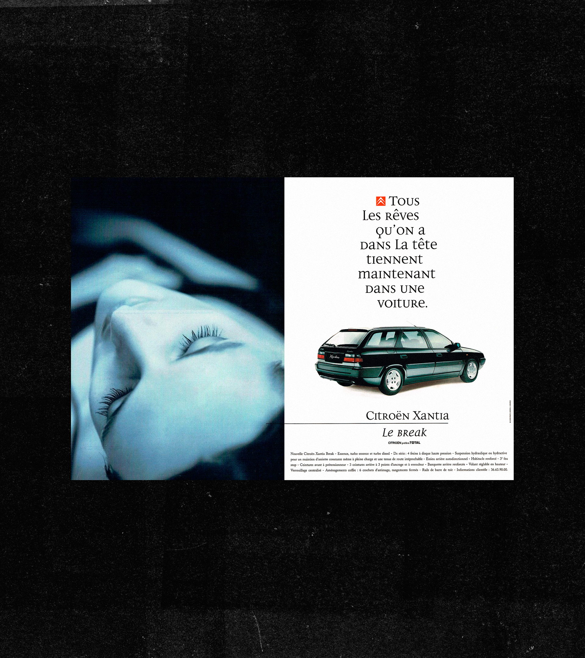 L'affiche principale joue sur un renversement visuel marqué. À gauche, un visage féminin aux yeux clos, baigné de lumière bleutée, presque irréelle. Le flou, les dominantes froides et le grain doux créent une sensation de flottement. On est dans le registre du rêve, de l'inconscient. À droite, la Xantia Break apparaît ultra nette sur fond blanc, détourée avec précision. Aucun décor superflu. La lumière neutre et l'ombre maîtrisée renforcent cette dimension rationnelle. La rencontre des deux univers forme le message central : le rêve rencontre le réel, l'émotion trouve son incarnation concrète.