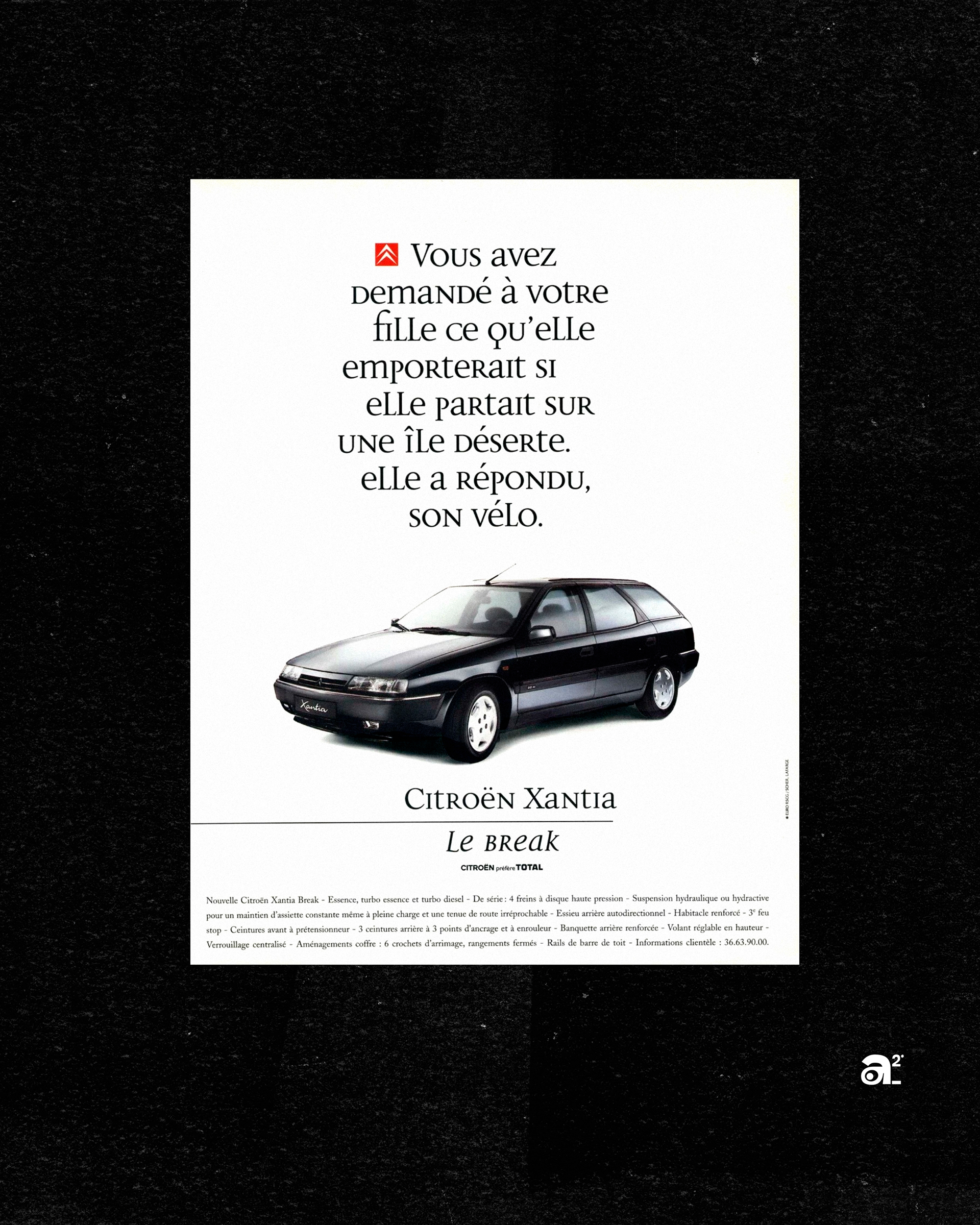 D'autres visuels misent davantage sur la narration écrite. L'un d'eux interpelle directement le lecteur : « Vous avez demandé à votre fille ce qu'elle emporterait si elle partait sur une île déserte. Elle a répondu, son vélo. » Cette anecdote révèle l'attachement affectif aux objets du quotidien et positionne subtilement la Xantia Break comme la seule capable d'embarquer ce qui compte vraiment.