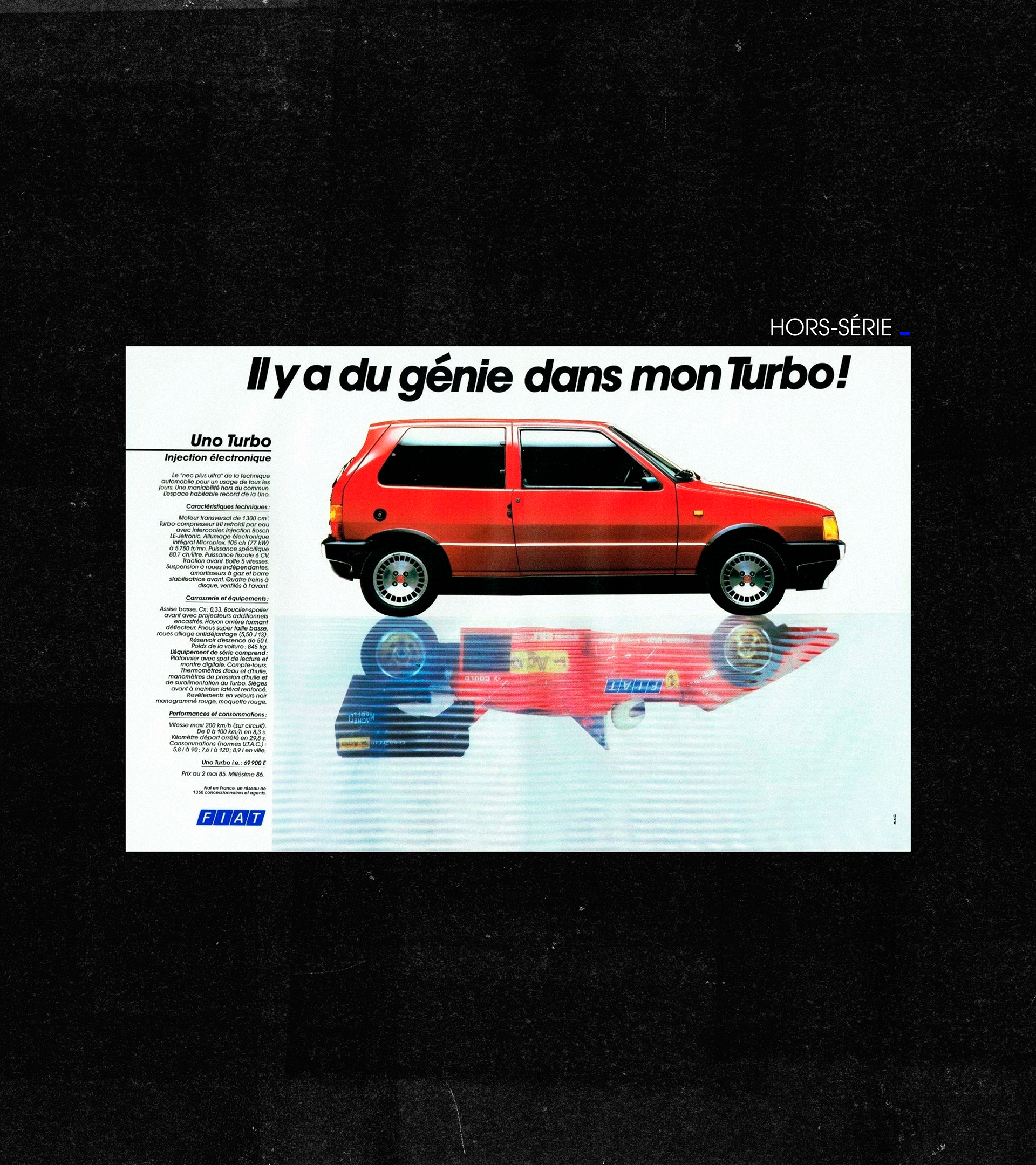 Description : Lorsque Fiat lance la Uno Turbo en 1985, la marque italienne entend bousculer le segment des citadines sportives. Sous ses airs de petite voiture du quotidien, elle embarque un moteur turbo à injection électronique capable de tenir tête à des concurrentes bien établies comme la Golf GTI ou la Peugeot 205 GTI. Un positionnement ambitieux, porté par un mot qui fait alors à lui seul vendre : « turbo ». Pour défendre cette montée en gamme sportive sur un marché très disputé, Fiat mise sur une communication à la hauteur de ses ambitions.