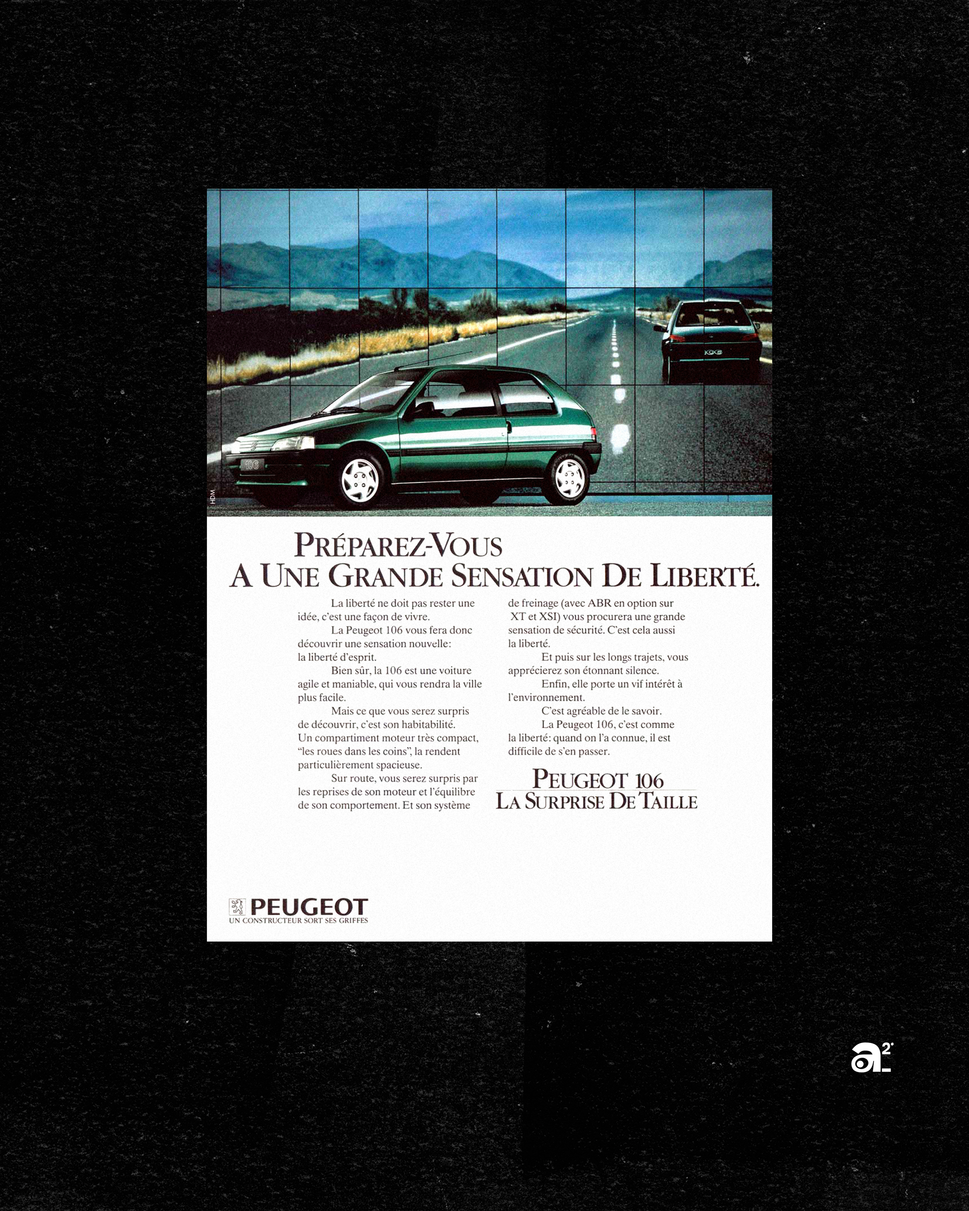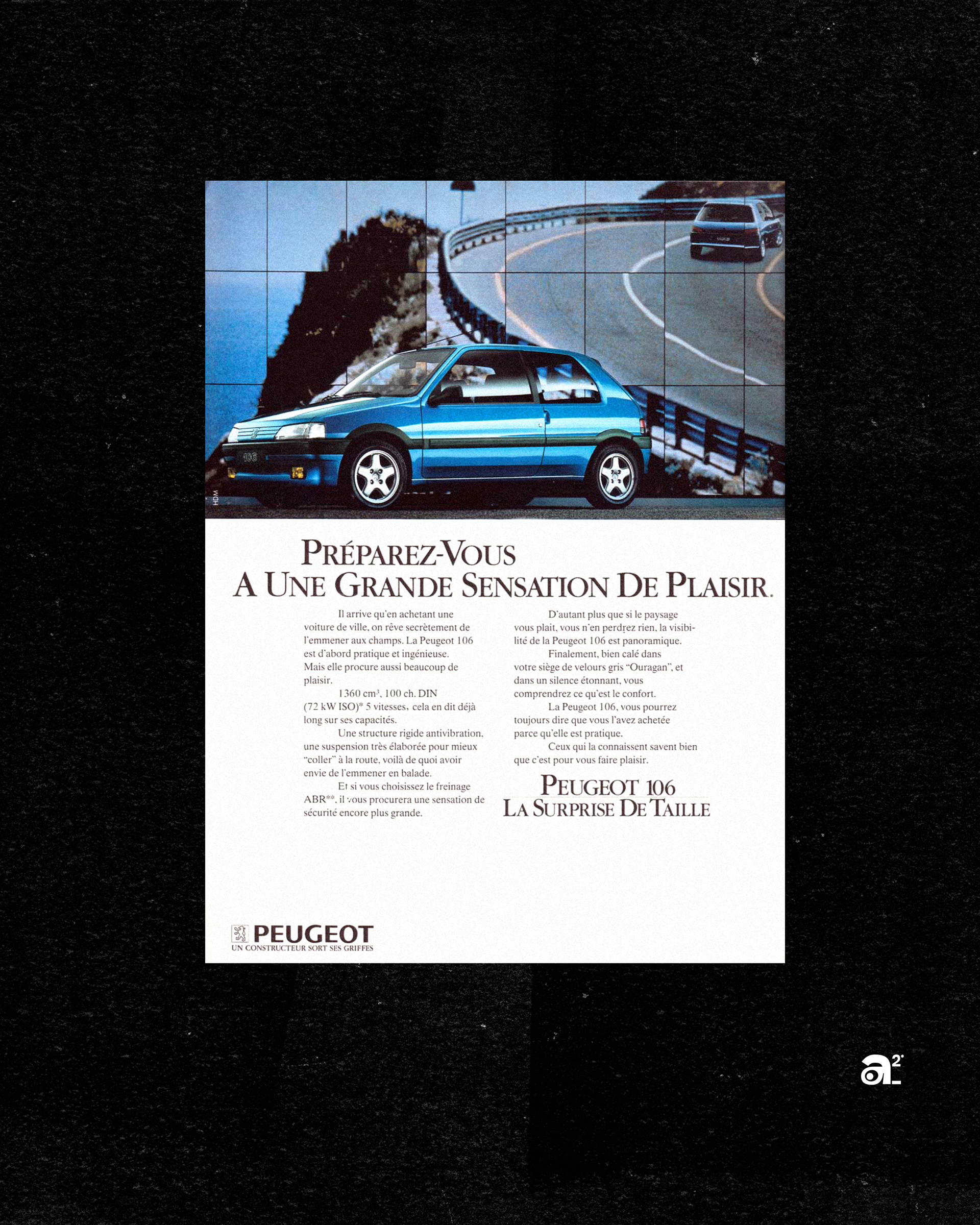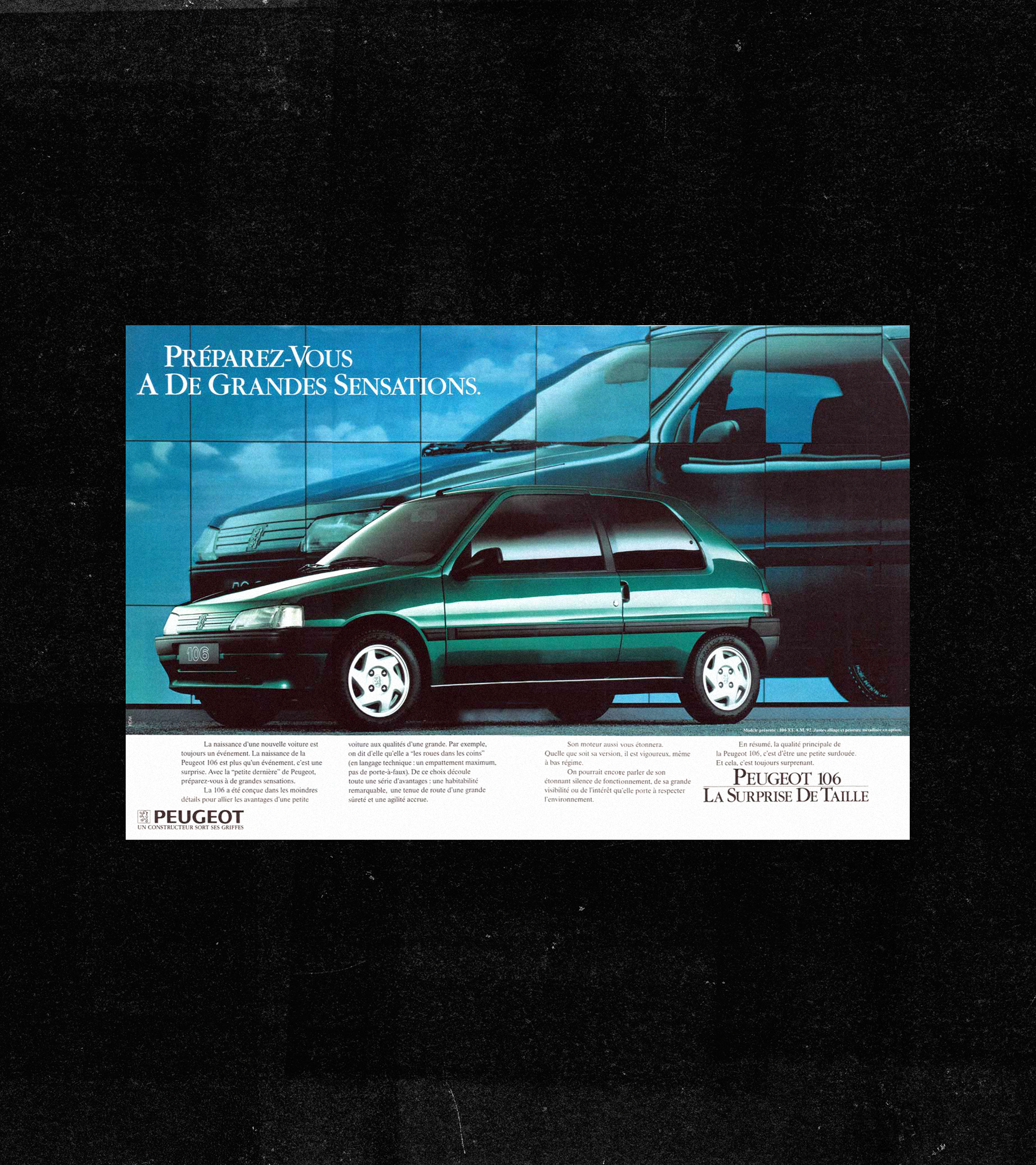 Les visuels s’organisent en trois parties distinctes. En haut, le message « PRÉPAREZ-VOUS À DE GRANDES SENSATIONS » s’affiche en majuscules. Le texte n’est pas qu’un titre, c’est un élément graphique qui installe immédiatement une promesse d’envergure et attire l’œil. Au centre, la 106 est la seule vedette. Elle est présentée de trois-quarts, dans une position statique. La 106 n’est pas utilisée, elle est contemplée. Le choix du vert (ou bleu) métallisé apporte une touche statutaire. Derrière elle, la façade vitrée d’un immeuble sert de décor théâtral. Cette profondeur artificielle donne de la hauteur et de la monumentalité au modèle, créant un effet de « showroom » démesuré. Sur d’autres visuels, elle permet d’évoquer un sentiment d’évasion ou de grand air. De plus, c’est une astuce visuelle efficace pour faire paraître la carrosserie plus longue et plus élancée qu’elle ne l’est. L’ensemble repose sur une harmonie froide et soignée.