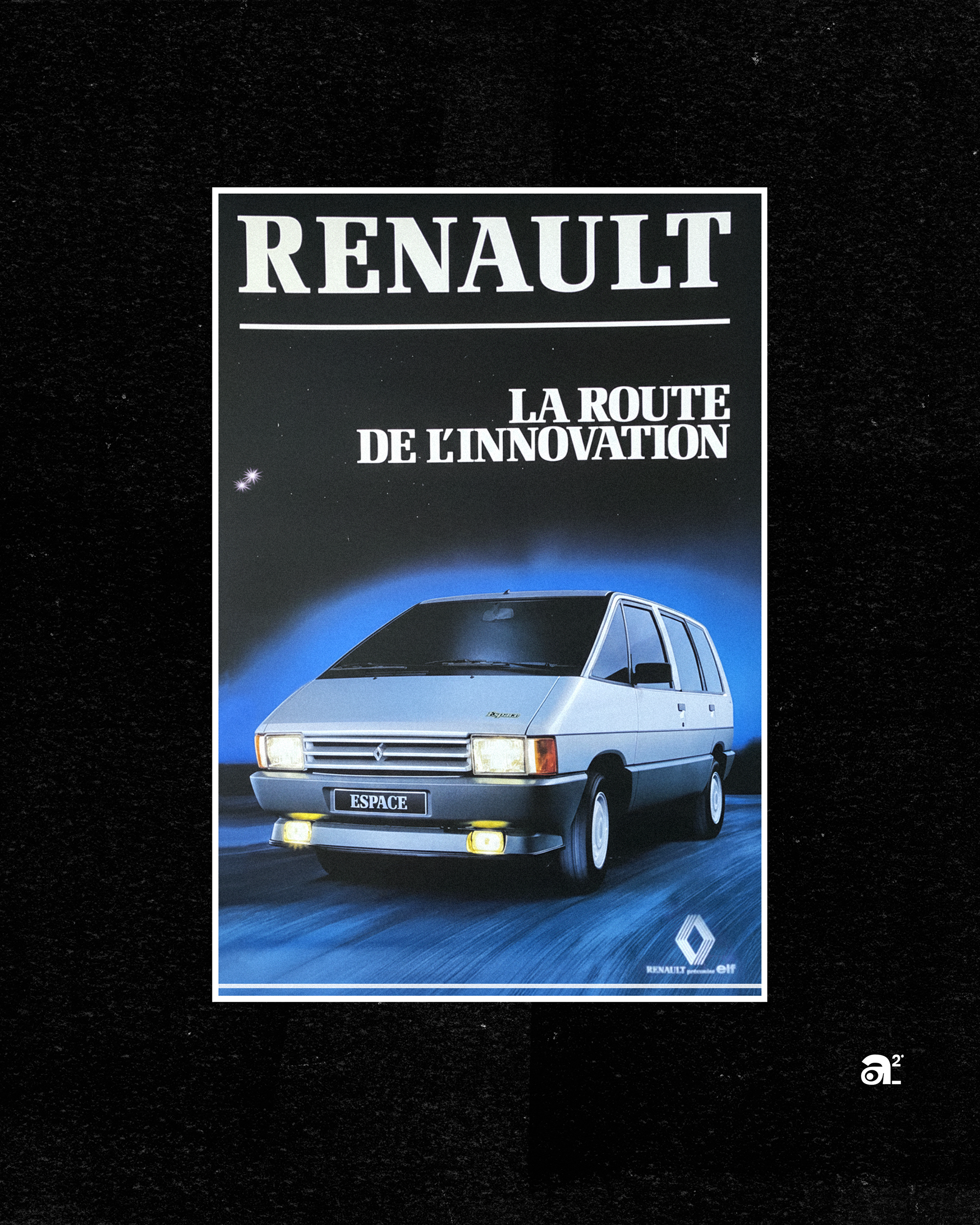 Pour accompagner cette ambition, Renault confie à Publicis une campagne qui s’éloigne volontairement des codes auto de l’époque. L’Espace n’est pas placé dans un décor identifiable, mais dans une scène entièrement construite. Un fond noir, un halo bleu presque cosmique, et la voiture au centre, posée comme un objet technologique plutôt qu’un véhicule du quotidien. Le cadrage 3/4 avant donne une présence forte, presque frontale, tandis que la perspective dirigée vers la droite suggère l’idée de progression et d’ouverture.